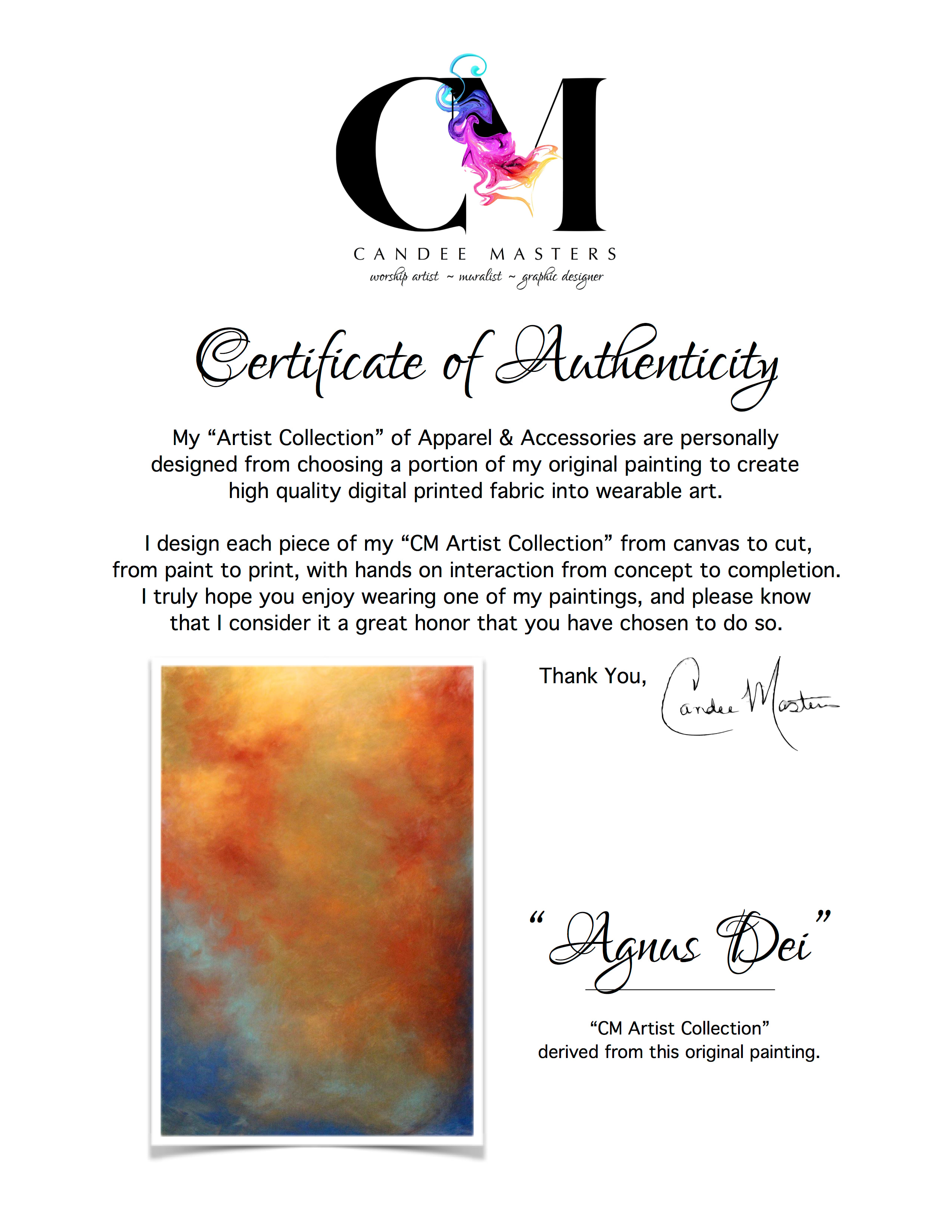 - *Each piece from "CM Artist Collection" comes with a "Certificate of Authenticity" card, displaying the original painting, from which Candee created your apparel or accessory from.
