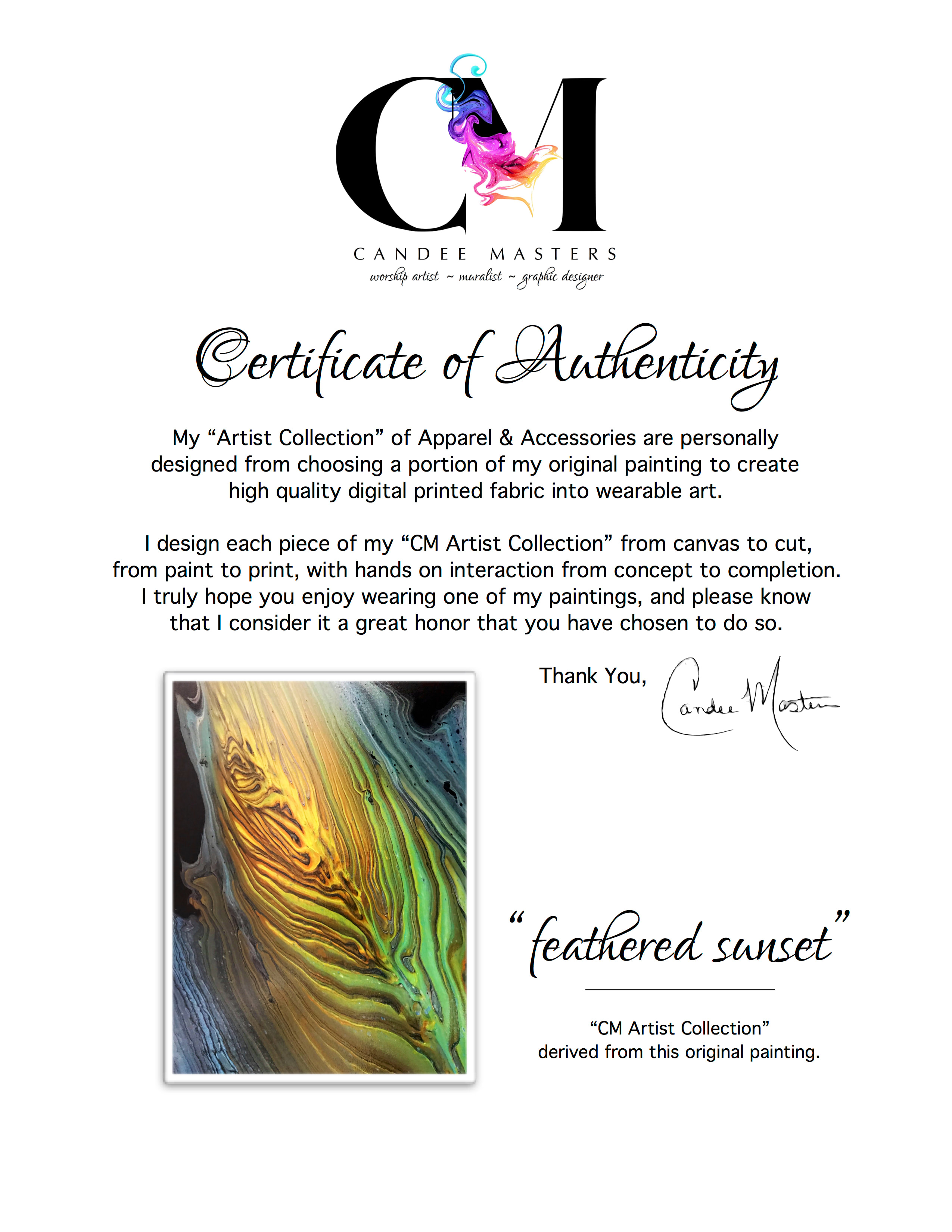 - *Each piece from "CM Artist Collection" comes with a "Certificate of Authenticity" card, displaying the original painting, from which Candee created your apparel or accessory from.