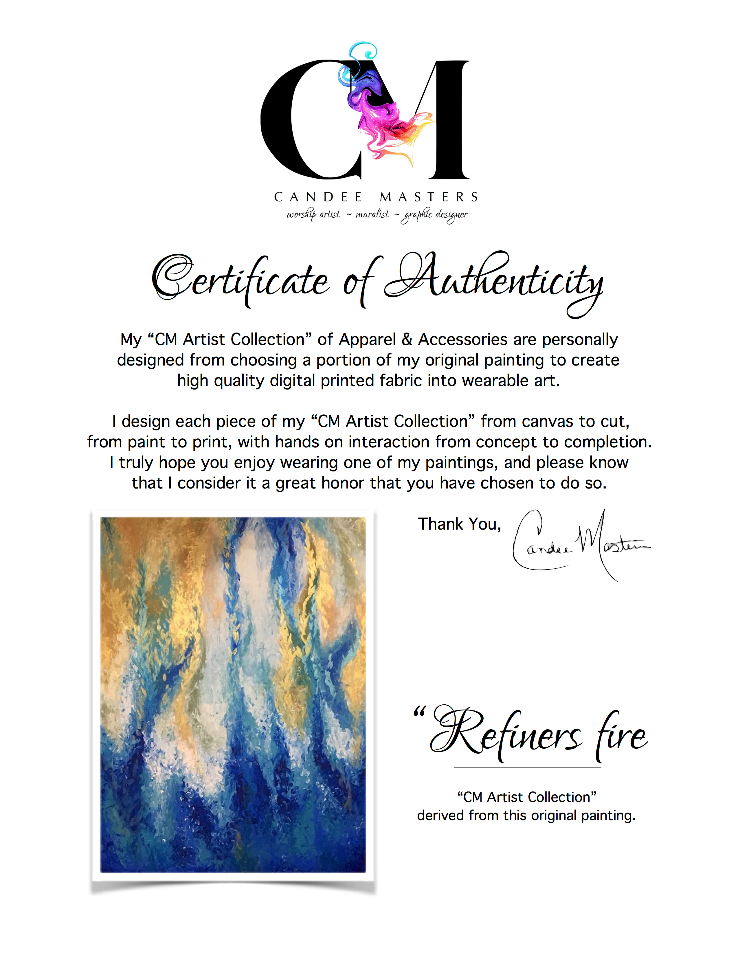 - *Each piece from "Artist Collection comes with a "Certificate of Authenticity" card, displaying the original painting, from which Candee created your apparel or accessory from.
